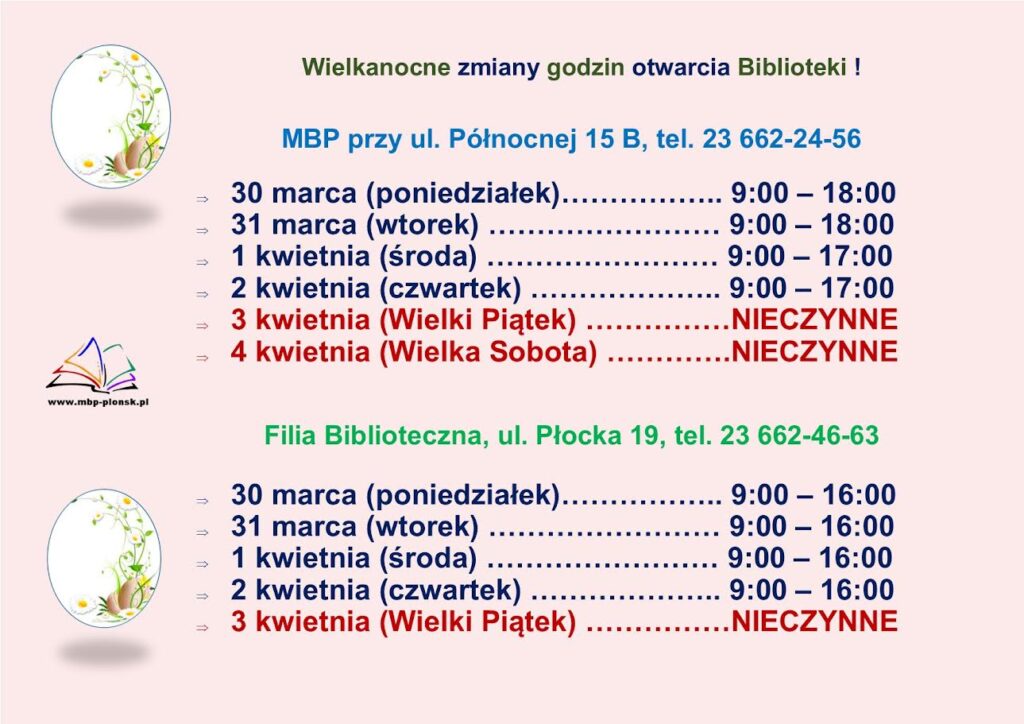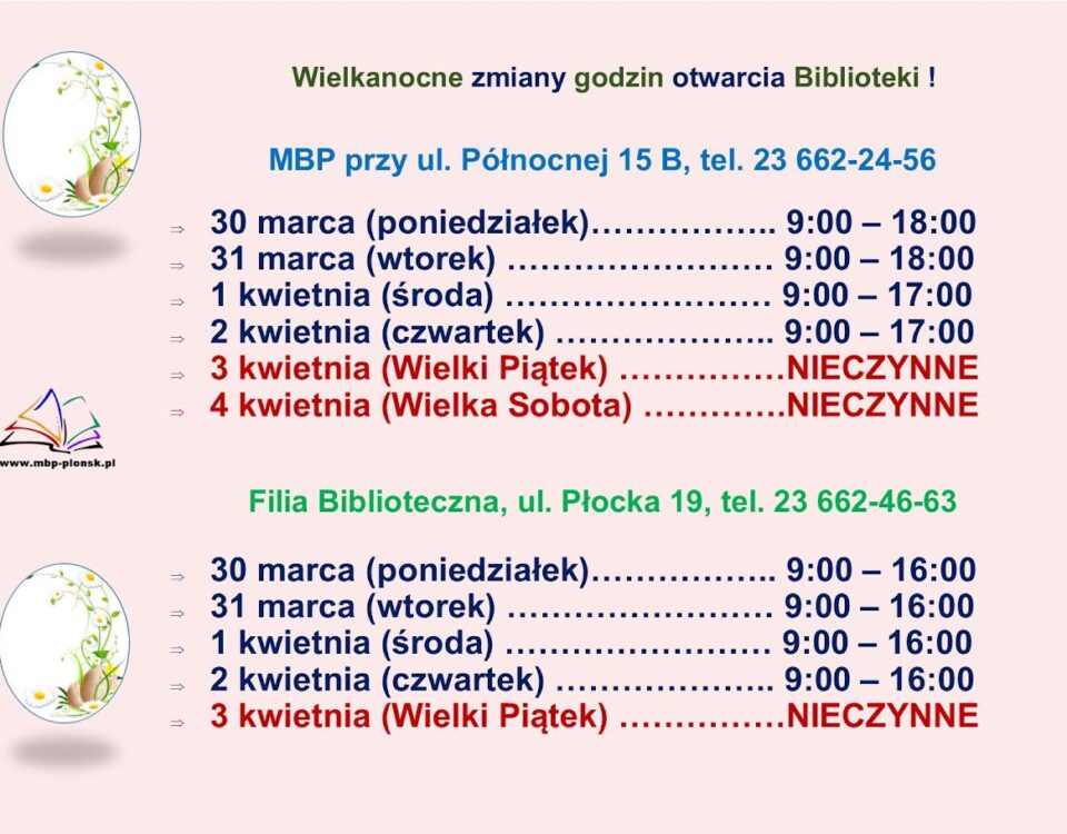Dzień Bibliotekarza i Bibliotek – 8 maja10 maja 202114. Festyn Rodzinny z okazji Dnia Dziecka28 maja 2021 zobacz Powiązane wpisyWielkanocne dyżuryCzytaj dalejZaproszenieCzytaj dalejŚwiatowy Dzień PoezjiCzytaj dalej