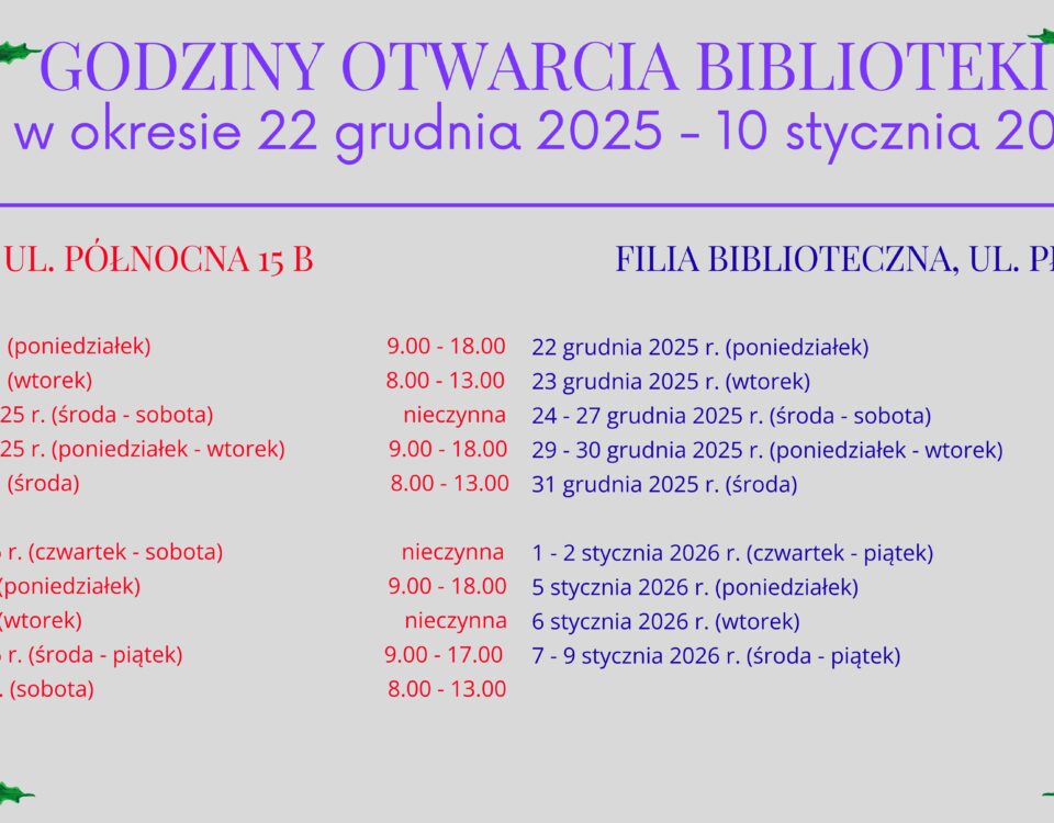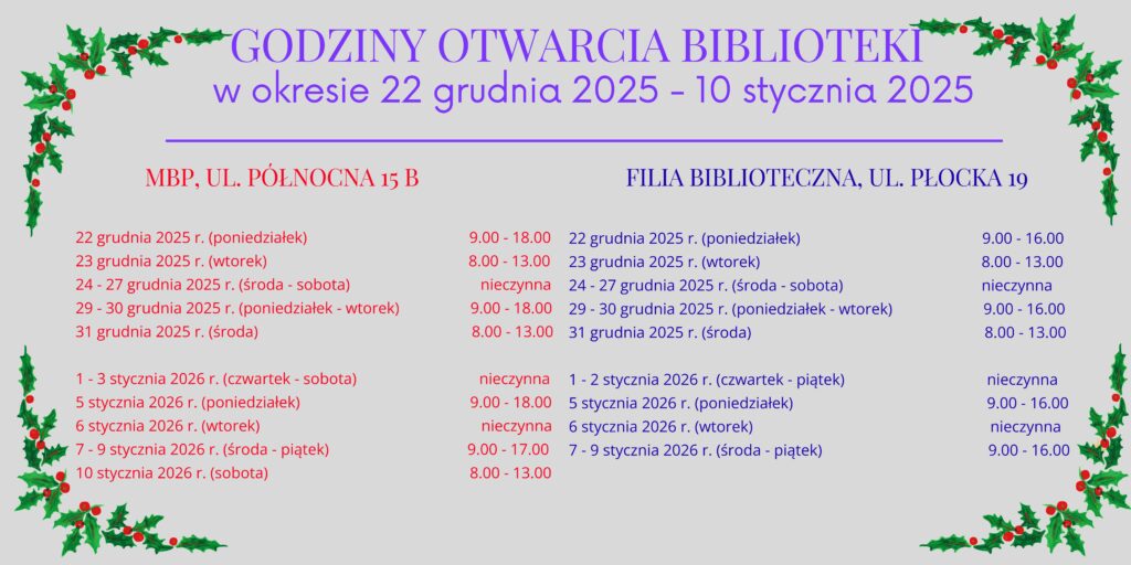 Narodowe Czytanie 20258 września 2025Laureaci Nagrody im. Kierbrdziow za rok 2025 przyznawana przez Bibliotekę Publiczną m. st. Warszawy Bibliotekę Główną Województwa Mazowieckiego1 października 2025 Powiązane wpisyUwagaCzytaj dalejSkontrum w CzytelniCzytaj dalejWystawa malarstwa: Stanisław Prokopczyk – Na palecie życiaCzytaj dalej