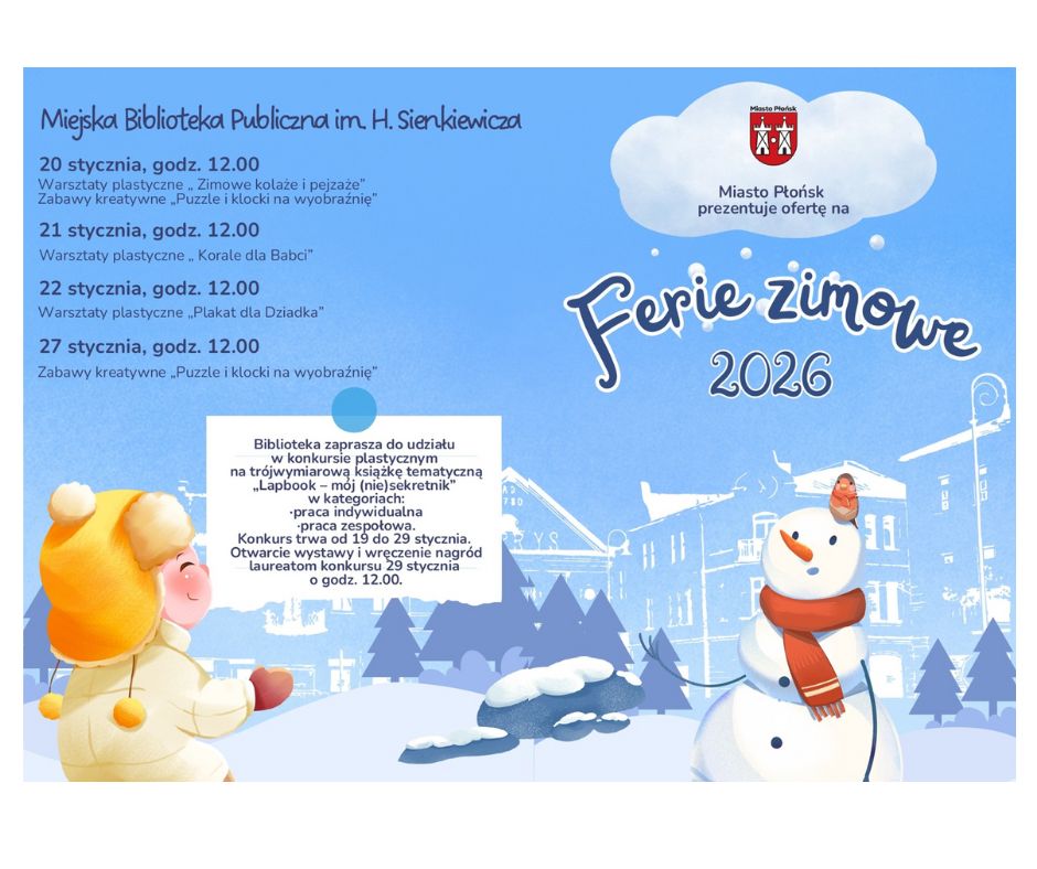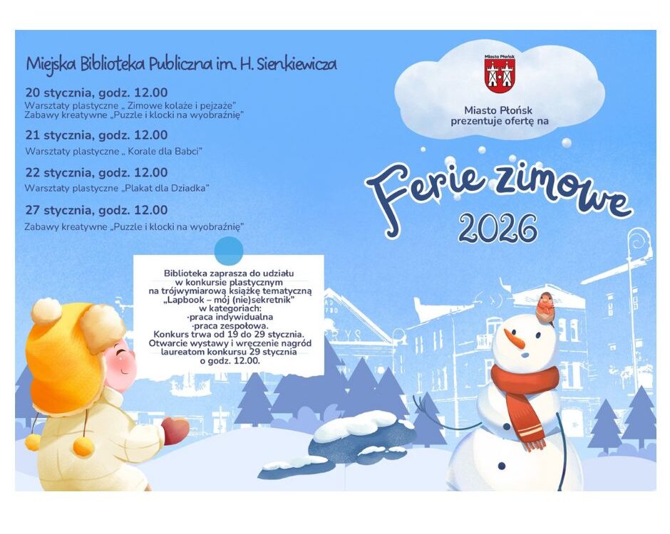 HISTORIA ZIEMI PŁOŃSKIEJ W KSIĘGACH ZAPISANA – czyli – ciekawostki zbiorów regionalnych12 października 2018Wystawa teatrzyków marionetkowych-LEGENDY POLSKIE13 grudnia 2018 Powiązane wpisyFerie zimowe w mieście 2026Czytaj dalejŻyczenia świąteczneCzytaj dalejUwagaCzytaj dalej