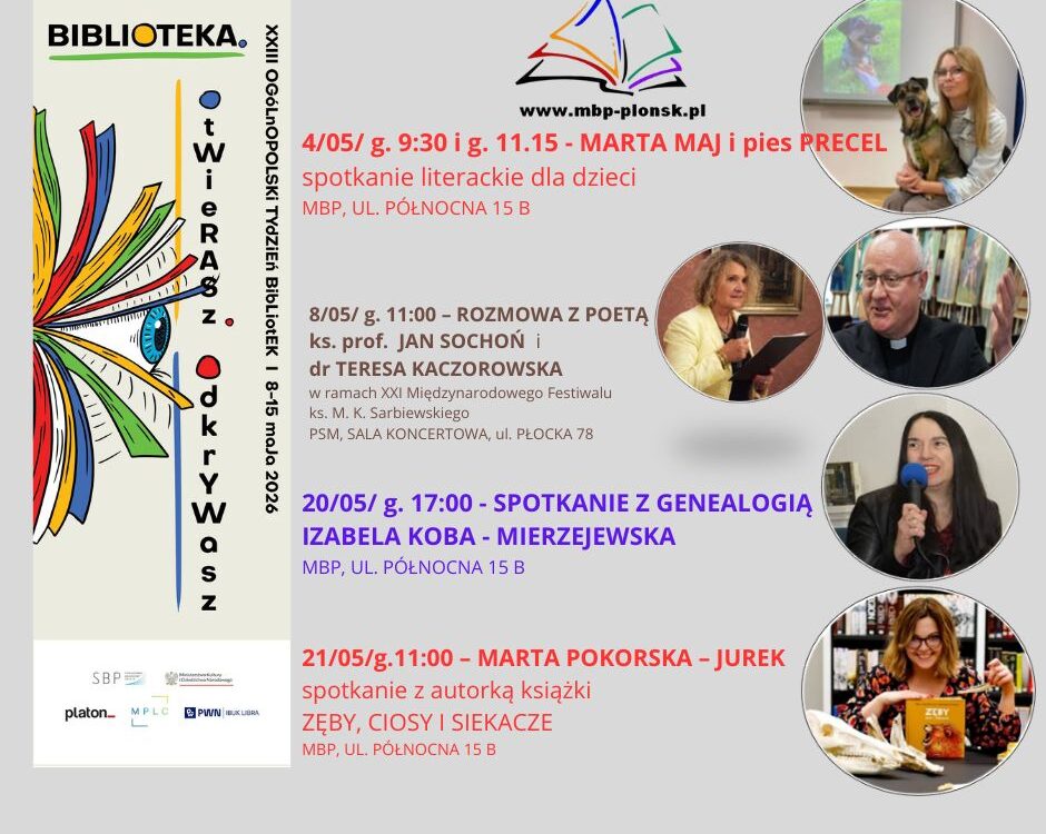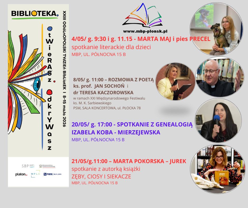 1058. Rocznica Chrztu Polski12 kwietnia 2024Światowy Dzień Książki i Praw Autorskich23 kwietnia 2024 więcej Powiązane wpisyZapraszamyCzytaj dalejMiędzynarodowy Dzień Książki dla DzieciCzytaj dalejŚwiatowy Dzień PoezjiCzytaj dalej